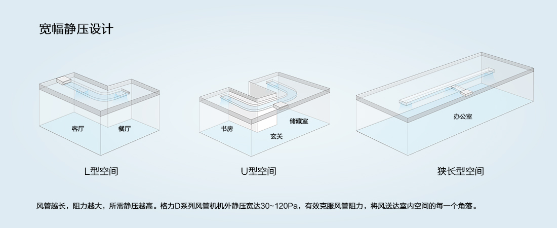 風(fēng)管越長,阻力越大,所需靜壓越高。格力D系列風(fēng)管機(jī)機(jī)外靜壓寬達(dá)30~120Pa,有效克服風(fēng)管阻力,將風(fēng)送達(dá)室內(nèi)空間的每一個角落。