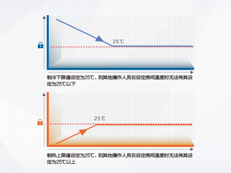 可通過(guò)線控器設(shè)置制冷下限值和制熱上限值,防止公共場(chǎng)所隨意調(diào)節(jié)空調(diào)造成能源浪費(fèi)。