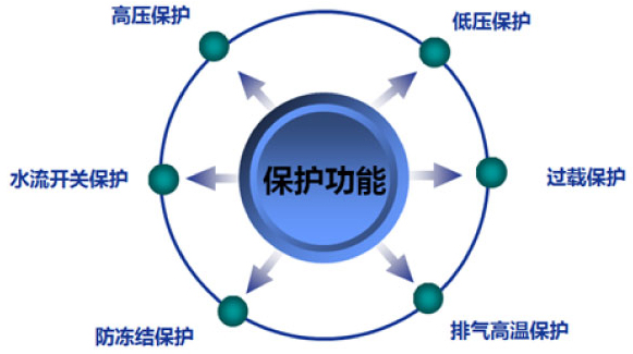 高壓保護(hù)、低壓保護(hù)、水流開關(guān)保護(hù)、過載保護(hù)、防凍結(jié)保護(hù)、排氣高溫保護(hù)。
