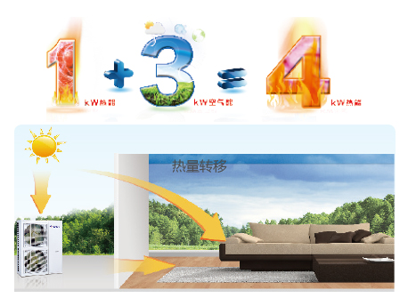 戶式強(qiáng)熱型暖冷一體機(jī)通過(guò)全新設(shè)計(jì),利用空氣中的低品位能源,用少量電能驅(qū)動(dòng),1份電能就可以吸收3份以上的空氣能,為用戶提供4份以上的熱能,降低用戶冬季采暖運(yùn)行費(fèi)用。