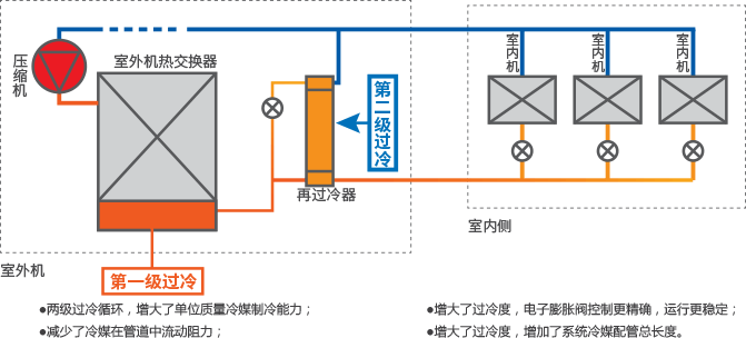 雙級(jí)過(guò)冷技術(shù),增大制冷能力和配管總長(zhǎng)