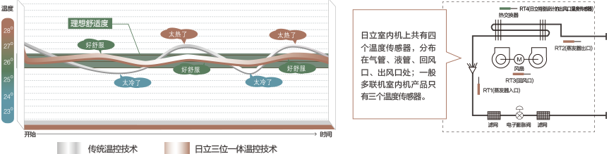 有時(shí)候,室內(nèi)的微小溫差往往也深刻影響著顧客的體驗(yàn)與感受,新一代CAMⅢ室內(nèi)機(jī)采用日立三位一體溫控技術(shù),通過(guò)回風(fēng)溫度傳感器、遙控溫度傳感器與特別設(shè)計(jì)的出風(fēng)溫度傳感器,實(shí)時(shí)采集出風(fēng)溫度防冷風(fēng),通過(guò)微電腦控制2000脈沖的高精度電子膨脹閥調(diào)節(jié)制冷劑流量,同時(shí)將出風(fēng)溫度控制在理想的范圍,實(shí)現(xiàn)線控器±0.5℃精準(zhǔn)調(diào)節(jié),更好的滿足人體舒適性。