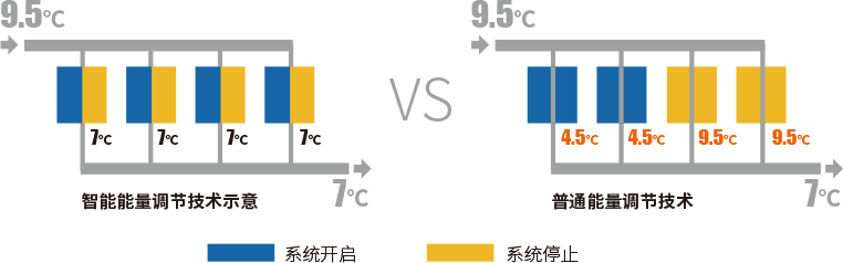 智能能量調(diào)節(jié)技術(shù),多模塊組合運(yùn)行時,為減少水溫波動,各模塊優(yōu)先加載各模塊機(jī)組的第一個系統(tǒng),再開始加載模塊機(jī)組的第二個系統(tǒng);同理,減載時先優(yōu)先減載各模塊機(jī)組的第二個系統(tǒng)。智能能量調(diào)節(jié)技術(shù)有利于平衡和調(diào)節(jié)部分負(fù)荷下的模塊機(jī)組進(jìn)出水溫差,提高部分負(fù)荷下機(jī)組的運(yùn)行能力和能效比,并提高水換熱器的防凍能力,運(yùn)行更穩(wěn)定。