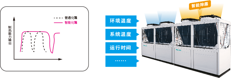 機(jī)組的控制系統(tǒng)可根據(jù)制熱運(yùn)行的環(huán)境溫度、蒸發(fā)器內(nèi)蒸發(fā)溫度及運(yùn)行時間等參數(shù)綜合判斷是否需要進(jìn)入除霜,滿足除霜條件后機(jī)組自動進(jìn)入化霜程序,機(jī)組化霜時間短、制熱運(yùn)行效率高達(dá)90%以上,可達(dá)2小時不除霜,確保優(yōu)異制熱能力和高能效比。