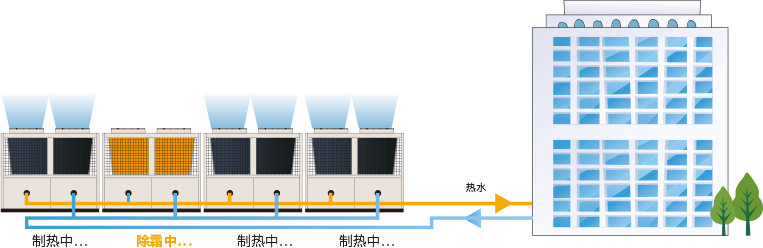 模塊組合時,主控器將均衡各模塊的除霜時間,避免組合模塊各單模塊同時進(jìn)入除霜運(yùn)轉(zhuǎn);無需除霜的模塊將繼續(xù)制熱運(yùn)轉(zhuǎn),保證制熱不停機(jī)。
