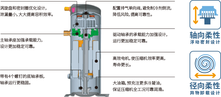 產(chǎn)品采用高效的全封閉渦旋壓縮機(jī),通過采用出色的高效軸向+徑向柔性密封技術(shù),確保機(jī)組運(yùn)行高效、穩(wěn)定,噪音低,壓縮機(jī)運(yùn)行振動小,壽命長。