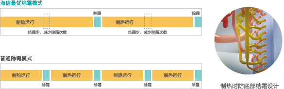 室外機(jī)采用室外溫度傳感器和熱交換器溫度傳感器,進(jìn)行變參數(shù)除霜,準(zhǔn)確把握除霜時機(jī),有效解決了“有霜不除,無霜除霜”的問題,單位時間結(jié)霜量明顯減少,只有普通除霜模式的1/3。