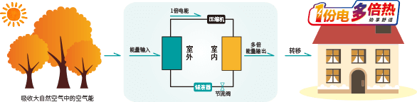 采用先進(jìn)的空氣源熱泵技術(shù),通過消耗少量電能驅(qū)動機(jī)器運(yùn)轉(zhuǎn),輕松吸收室外空氣中大量的免費(fèi)熱能,運(yùn)輸?shù)绞覂?nèi)釋放,為您營造舒適的家居生活。即:使用1份電能,便可從室外空氣中獲取3份以上免費(fèi)的空氣能,得到多份熱能收益,節(jié)能更高效。