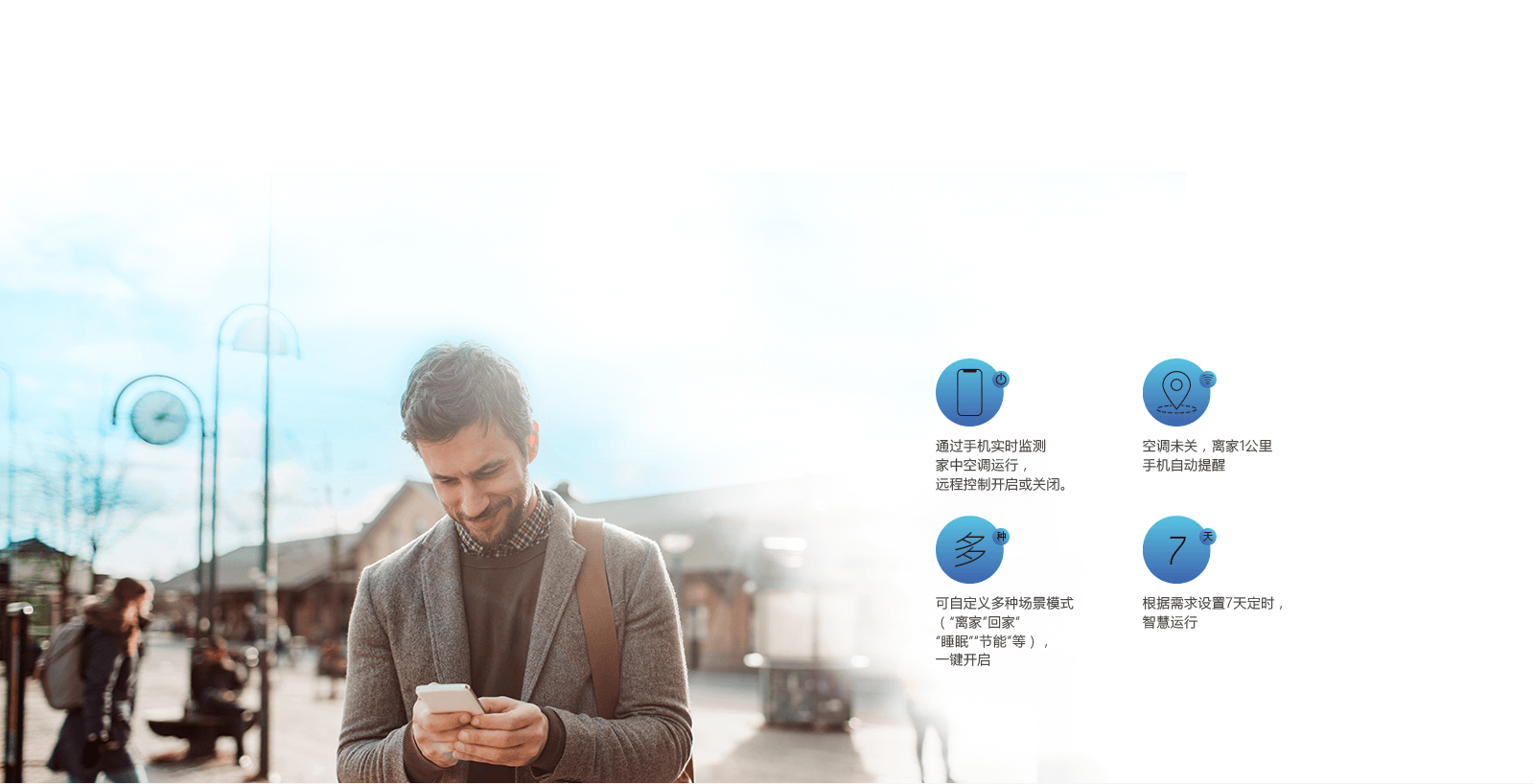 離家1公里提醒: 監(jiān)測(cè)到用戶離家1公里未關(guān)空調(diào)的情況,會(huì)通過(guò)手機(jī)向用戶發(fā)出提醒,避免不必要浪費(fèi)。