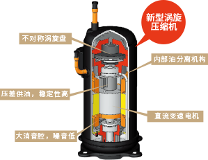 大容量髙壓腔渦旋壓縮機采用內(nèi)部油分離機構(gòu),通過內(nèi)部油霧分離器設(shè)計和內(nèi)部回油管設(shè)計,使壓縮機潤滑油大部分保存在壓縮機內(nèi),只有少量油被帶出壓縮機,有效防止因多余的冷凍油在制冷循環(huán)中造成的能力下降,效率進一步提高;采用防過壓縮技術(shù),有效的防止了冷凝壓力過髙而造成的功耗增加問題,壓縮機運轉(zhuǎn)更節(jié)能,同時使得制冷系統(tǒng)更加穩(wěn)定可靠。