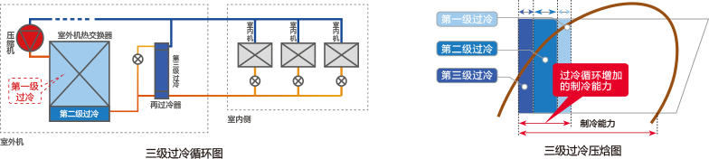 經(jīng)過前兩級過冷的冷媒,會通過高效的板式換熱器,利用膨脹閥的精準調(diào)節(jié),實現(xiàn)最優(yōu)的旁通過冷卻。 釆用三級過冷卻技術(shù),可達成30°C過冷度,實現(xiàn)更好的性能、適應(yīng)更長的安裝配管和高落差,滿足用戶節(jié)能和安裝需求。