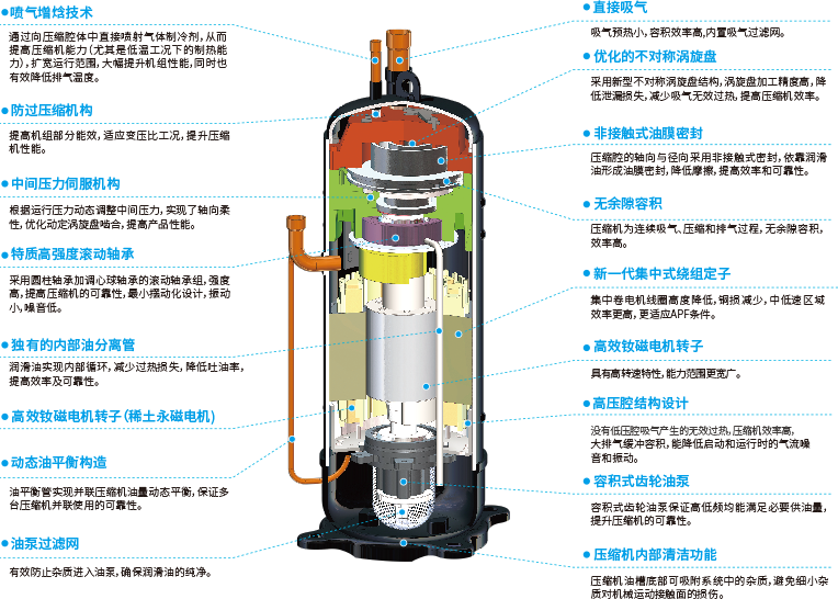 SET-FREE A 系列全系產(chǎn)品采用日立新一代直流變頻的噴氣增焓渦旋壓縮機(jī),在實(shí)現(xiàn)低溫制熱能力的同時(shí),保證壓縮機(jī)運(yùn)行的可靠與安全,大大提升整機(jī)運(yùn)行的動(dòng)力與能效,實(shí)現(xiàn)強(qiáng)勁制熱、節(jié)能安全的運(yùn)行效果。全系列產(chǎn)品采用全變頻技術(shù),即全部壓縮機(jī)采用高性能直流變頻噴氣增焓渦旋式壓縮機(jī),室外機(jī)風(fēng)扇電機(jī)采用直流變頻電機(jī),給用戶帶來非凡的用戶體驗(yàn)。