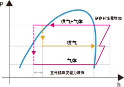 在制熱工況下,當(dāng)室外環(huán)境溫度很低時(shí),室外機(jī)熱交換能力下降, 壓縮機(jī)正?;貧饪诘幕貧饬繙p少,但通過中間壓力回氣噴射補(bǔ)充 制冷劑氣體,從而增加壓縮機(jī)的排氣量,室內(nèi)機(jī)熱交換器制熱的 循環(huán)制冷劑流量增加,實(shí)現(xiàn)了制熱量增加。