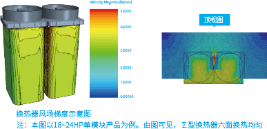 低壓損∑型換熱器結(jié)構(gòu)設(shè)計(jì),六面換熱結(jié)構(gòu),換熱面積大幅提升,左、右換熱器通過多流程鏡像對稱設(shè)計(jì),確保換熱器的換熱均衡性;同時(shí)配合雙風(fēng)扇設(shè)計(jì),實(shí)現(xiàn)同等風(fēng)量條件下的換熱器風(fēng)場梯度分布更均勻,使換熱器換熱效率更高。同時(shí)換熱器自身高度更高,換熱面積更大,通過分流支路流程低壓損設(shè)計(jì)優(yōu)化,提升冷媒換熱效率,確保整機(jī)換熱性能強(qiáng)勁。