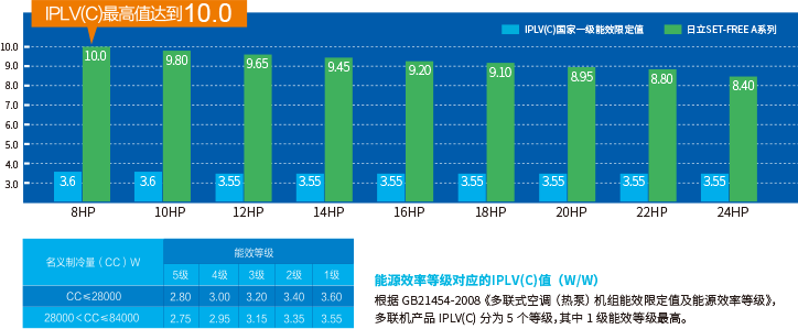 IPLV(C)值是當(dāng)前衡量多聯(lián)機(jī)空調(diào)能效值的國家標(biāo)準(zhǔn)。通過核心技術(shù)的不斷革新以及系統(tǒng)的整體優(yōu)化,日立SET-FREE A系列產(chǎn)品的節(jié)能性更加出色,全系列產(chǎn)品均通過國家一級節(jié)能認(rèn)證,IPLV(C)值可達(dá)10.0 (8HP產(chǎn)品)。