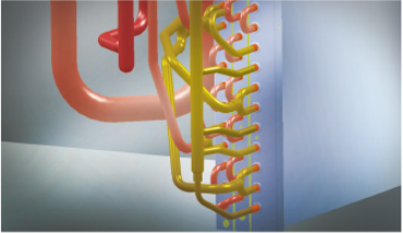 如下圖所示,通過特殊設(shè)計(jì)的“2-1”流程,使得制冷時(shí)的液相側(cè)的流速増大,換熱效率提升,増加過冷度。