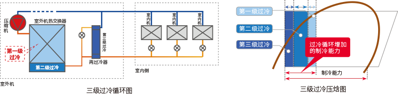 釆用三級過冷卻技術(shù),可達(dá)成35°C過冷度,實(shí)現(xiàn)更好的性能、適應(yīng)更長的安裝配管和高落差,滿足用戶節(jié)能和安裝需求。 *(具體操作謫咨詢技術(shù)人員)