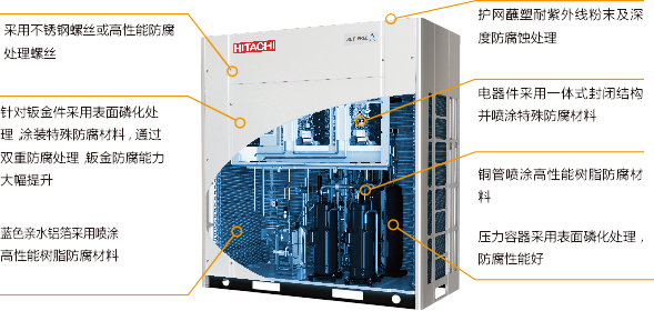 日立無懼沿海等特殊應(yīng)用場合,采用高精尖防腐蝕技術(shù)和防腐材料,延長空調(diào)機(jī)組正常的使用壽命,針對各類部件的防腐技術(shù),如下圖所示: