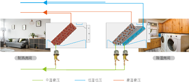 陰雨季節(jié)的高濕天氣,溫度適中時(shí),可進(jìn)行不降溫除濕運(yùn)轉(zhuǎn)。制冷時(shí)室內(nèi)機(jī)有兩個(gè)換熱器,通過(guò)第一換熱器進(jìn)行制冷除濕,通過(guò)第二換熱器對(duì)制冷后的冷風(fēng)進(jìn)行升溫,從而保證溫度恒定,干爽舒適。