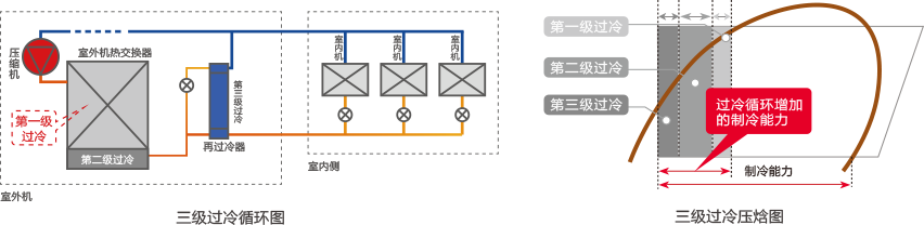 采用三級過冷卻技術(shù),可達成30℃過冷度,實現(xiàn)更好的性能、適應(yīng)更長的安裝配管和高落差,滿足用戶節(jié)能和安裝需求。
