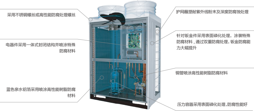 日立無懼沿海等特殊應(yīng)用場合,采用高精尖防腐蝕技術(shù)和防腐材料,延長空調(diào)機組正常的使用壽命,針對各類部件的防腐技術(shù)如下圖所示:
