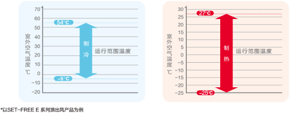 日立SET-FREE E 系列能在較寬的溫度范圍內(nèi)運(yùn)行,制熱運(yùn)轉(zhuǎn)最低可達(dá)-25℃,冬季制熱效果好??蓪崿F(xiàn)54℃高溫制冷,可靈活應(yīng)對特殊氣候環(huán)境,滿足不同環(huán)境下用戶的個性化使用需求。