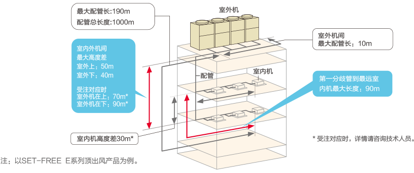 單管長度增加可達(dá)到190米,室內(nèi)機(jī)與室外機(jī)的高度差可達(dá)90米*,方便安裝。