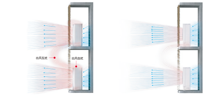 SET-FREE E側(cè)出風(fēng)系列優(yōu)化風(fēng)道設(shè)計,增加風(fēng)道高度至113mm,配合大功率DC電機(jī),排風(fēng)距離可達(dá)6米,排風(fēng)強(qiáng)勁,避免回風(fēng)短路,強(qiáng)力保證空調(diào)制冷效果。同時,外機(jī)風(fēng)罩升級為束流格柵,送風(fēng)更集中,排出氣流更強(qiáng)勁;格柵布局全新設(shè)計,送風(fēng)阻力更小,噪音更低。