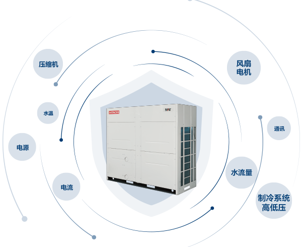 機組設計有壓縮機、風扇電機、水流量、制冷系統高低壓、水溫、電源、電流、通訊等多項安全保護功能,確保機組及系統的安全穩(wěn)定運行