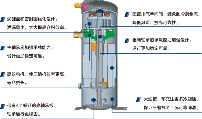 采用R410A高效全封閉渦旋壓縮機,其高效軸向+徑向柔性密封技術,確保機組運行高效穩(wěn)定、低噪音,使用壽命更長。低壓腔結構設計,電機腔和曲軸箱處于較低溫區(qū)域,電機被低溫回氣制冷劑有效冷卻,延長電機壽命;高溫高壓制冷劑氣體被壓縮后直接排出,減少壓力和熱損失,提高能效。