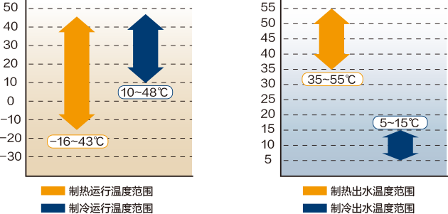 制冷運行環(huán)境溫度范圍:10~48℃;制熱運行環(huán)境溫度范圍:-16~43℃(帶全年制熱功能)