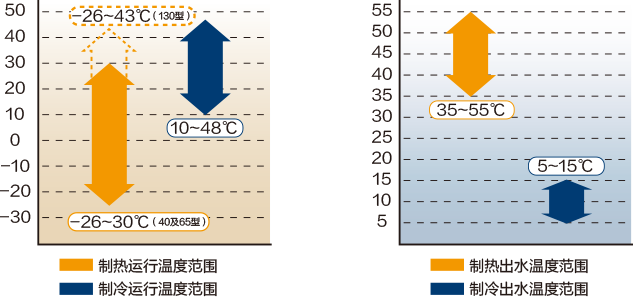 制熱運行環(huán)境溫度:-26~30℃(40及65型)/ -26~43℃(130型);制冷運行環(huán)境溫度:10~48℃