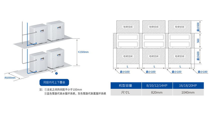 機組單個模塊可實現(xiàn)模塊化組合、拼接安裝,多臺機組可集中疊放。分歧管選配更靈活,可根據(jù)下游室內(nèi)機容量截取不同管徑,極大方便了現(xiàn)場制冷管路及水管的施工,大大簡化了施工程序。