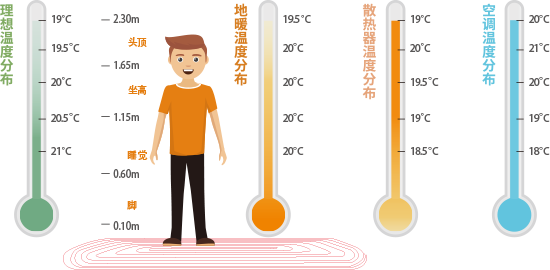 通過地面輻射持續(xù)供熱,均勻性好,房間的每個角落都一樣溫暖;且室內(nèi)溫度恒定波動小,不會忽冷忽熱,讓您享受持久恒定的溫暖! 無熱風直吹身體,衛(wèi)生無揚塵且不會有吹風感,即便寒冷的冬季也能光腳在地面上行走,不必擔心會受涼,從此安享舒心生活! 地板向上輻射傳熱,不會輕易帶走皮膚表面水分,舒適不干燥,而且腳暖頭涼,神清氣爽,家居生活就是這么溫暖愜意!