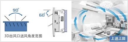 行業(yè)領(lǐng)先3D送風面板,上下0~60°自由擺風,左右-45°~45°擺風,全面覆蓋房間每一個角落,避免因室內(nèi)冷熱不均造成的體感不適,讓室內(nèi)每個角落都能暢享舒適送風。