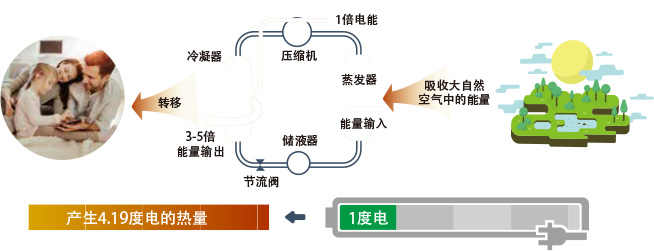 COP能效值高達4.19,即每消耗1度電可產(chǎn)生4.19度電的熱量。約克地暖中央空調(diào)先從室外大自然中獲取免費空氣能,再通過較少的電能,將其轉(zhuǎn)化成室內(nèi)熱量,極大減少了用電成本,就算再寒冷的冬季,也能為家強效制熱! 熱泵可將室內(nèi)熱量轉(zhuǎn)移到室外,進行空調(diào)制冷; 熱泵也能將室外的低溫熱能進行吸收,轉(zhuǎn)化為高溫熱能,用于地暖制熱。