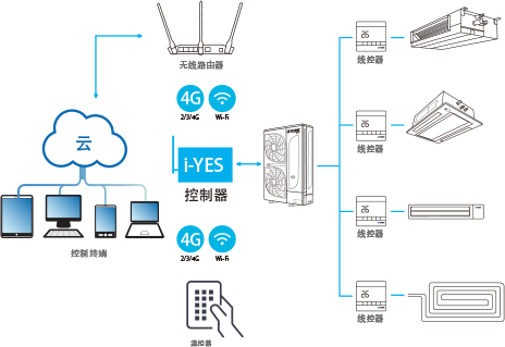 遠程控制,手機與iPad,4G與WiFi,暢享互聯(lián); 一鍵情景模式,設(shè)置不同場景模式下的運轉(zhuǎn)狀態(tài); 智能定時,7日x24小時日程循環(huán)設(shè)定; 超級多聯(lián),最多可控16臺室外機,32臺室內(nèi)機; 便捷多控,1個終端控制多臺i-YES智能移動終端控制系統(tǒng),也可多個終端控制1臺i-YES智能移動終端控制系統(tǒng); 云備份,設(shè)置信息可遠程備份,即使手機更換也沒問題; 故障自檢,自動記錄并顯示。