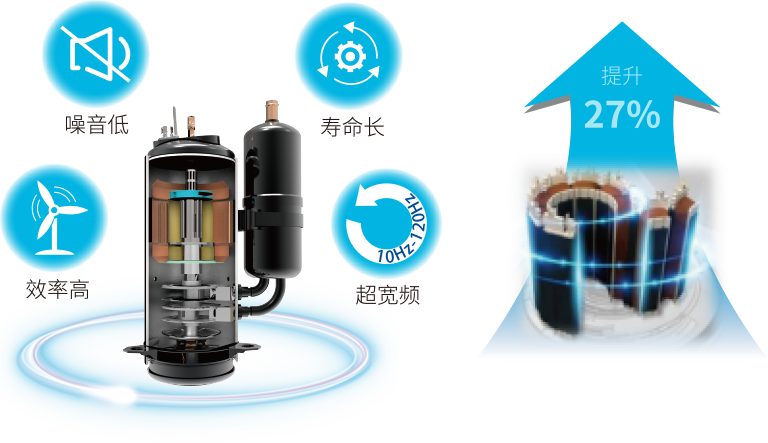 采用約克品牌直流變頻壓縮機、BLDC直流電機搭配DC直流室內(nèi)機和高精度電子膨脹閥,搭載直流變頻技術(shù),構(gòu)成超強全直流變頻系統(tǒng),實現(xiàn)高效穩(wěn)定的運行狀態(tài),大幅提高運轉(zhuǎn)效率,動力強勁。