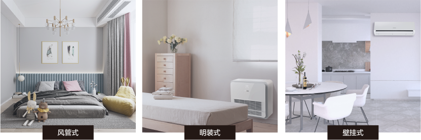 EX系列配有三款不同的室內(nèi)機(jī)機(jī)型,可根據(jù)空間、房型靈活選擇,隱藏式安裝的薄型風(fēng)管機(jī)、半嵌入式安裝的上下出風(fēng)明裝室內(nèi)機(jī)或壁掛機(jī),無論新房裝修或二手房改造,都可靈活選擇便捷安裝,完美匹配家裝風(fēng)格。