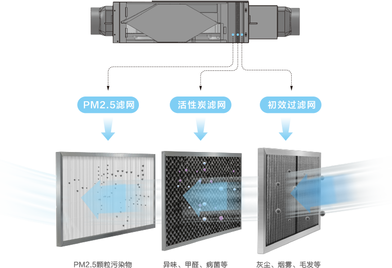當(dāng)室外空氣質(zhì)量極差、污染嚴(yán)重時(shí),不建議室內(nèi)引入新風(fēng),開啟旁通交換模式,關(guān)閉排風(fēng)口進(jìn)行內(nèi)循環(huán),空氣流經(jīng)三重過濾網(wǎng),高效凈化,改善空氣質(zhì)量。