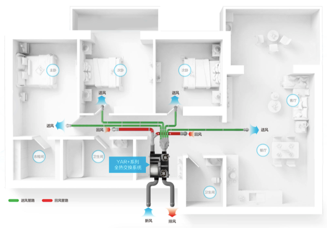系統(tǒng)經(jīng)過(guò)嚴(yán)格新風(fēng)方案設(shè)計(jì),由主機(jī)提供送排風(fēng)動(dòng)力,輸配管道延伸至各個(gè)房間,設(shè)置送風(fēng)口,即可滿(mǎn)足該房間的新風(fēng)需求。