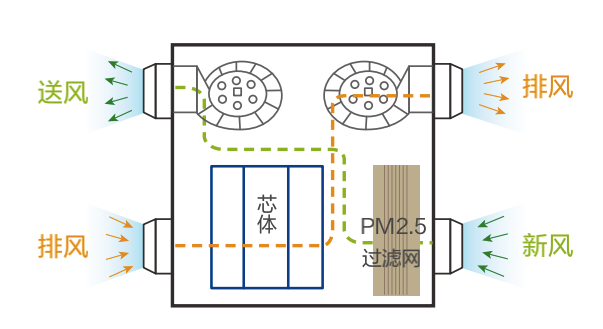 新風(fēng)引入后,經(jīng)過(guò)全熱交換器中的高效凈化濾網(wǎng),濾除新風(fēng)中的PM2.5、灰塵、毛發(fā)等后,方可送入室內(nèi)。
