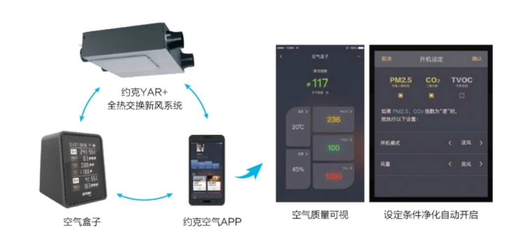 通過(guò)空氣盒子,可實(shí)時(shí)監(jiān)測(cè)空氣中的PM2.5、CO2、TVOC濃度以 及溫濕度,隨時(shí)知曉空氣質(zhì)量。 連接i-YES II移動(dòng)控制終端,還可與約克空氣APP實(shí)現(xiàn)遠(yuǎn)程聯(lián)動(dòng)。既可以遠(yuǎn)程監(jiān)測(cè)室內(nèi)外空氣質(zhì)量,更可實(shí)現(xiàn)遠(yuǎn)程凈化及自動(dòng)凈化—— 設(shè)定自動(dòng)凈化模式后,系統(tǒng)自動(dòng)聯(lián)動(dòng)室內(nèi)PM2.5、CO2、TVOC濃度,當(dāng)濃度指數(shù)為“差”時(shí),全熱交換新風(fēng)系統(tǒng)自動(dòng)開(kāi)啟送風(fēng)模式,為室內(nèi)進(jìn)行換氣。