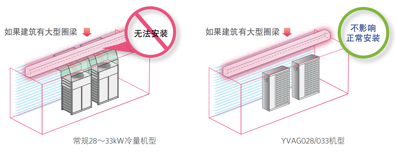 YVAG全變頻系列采用約克專利的外觀設(shè)計,小巧美觀,體積小于與傳統(tǒng)變頻空調(diào),充分滿足家用空調(diào)機位的安裝空間要求,布置更靈活。同時可以直接通過貨運電梯運送安裝,滿足高層建筑安裝需求。