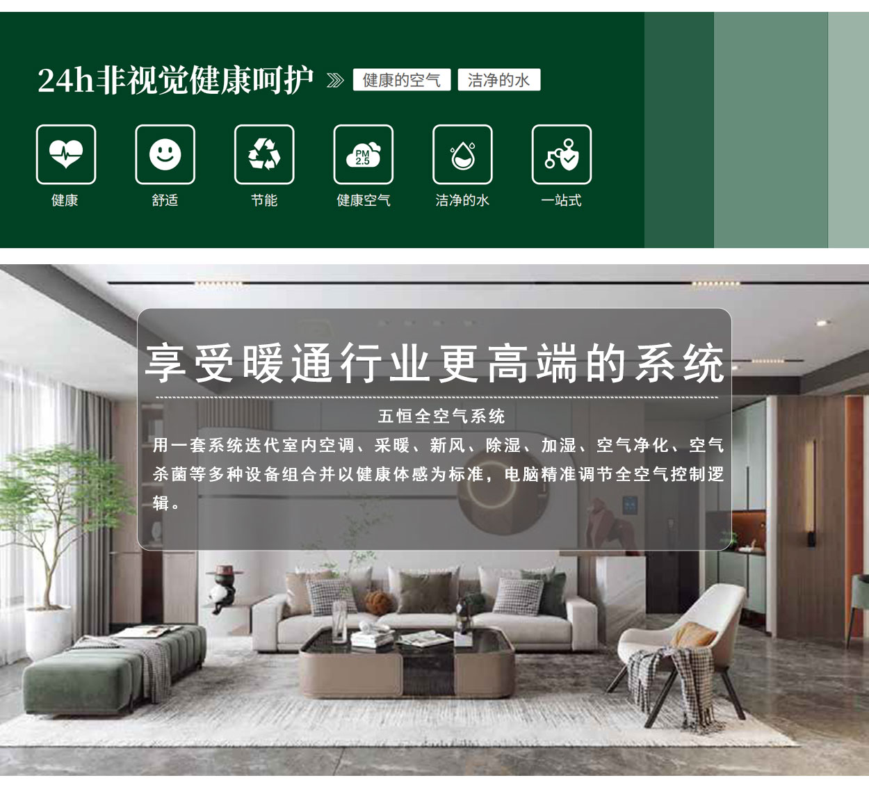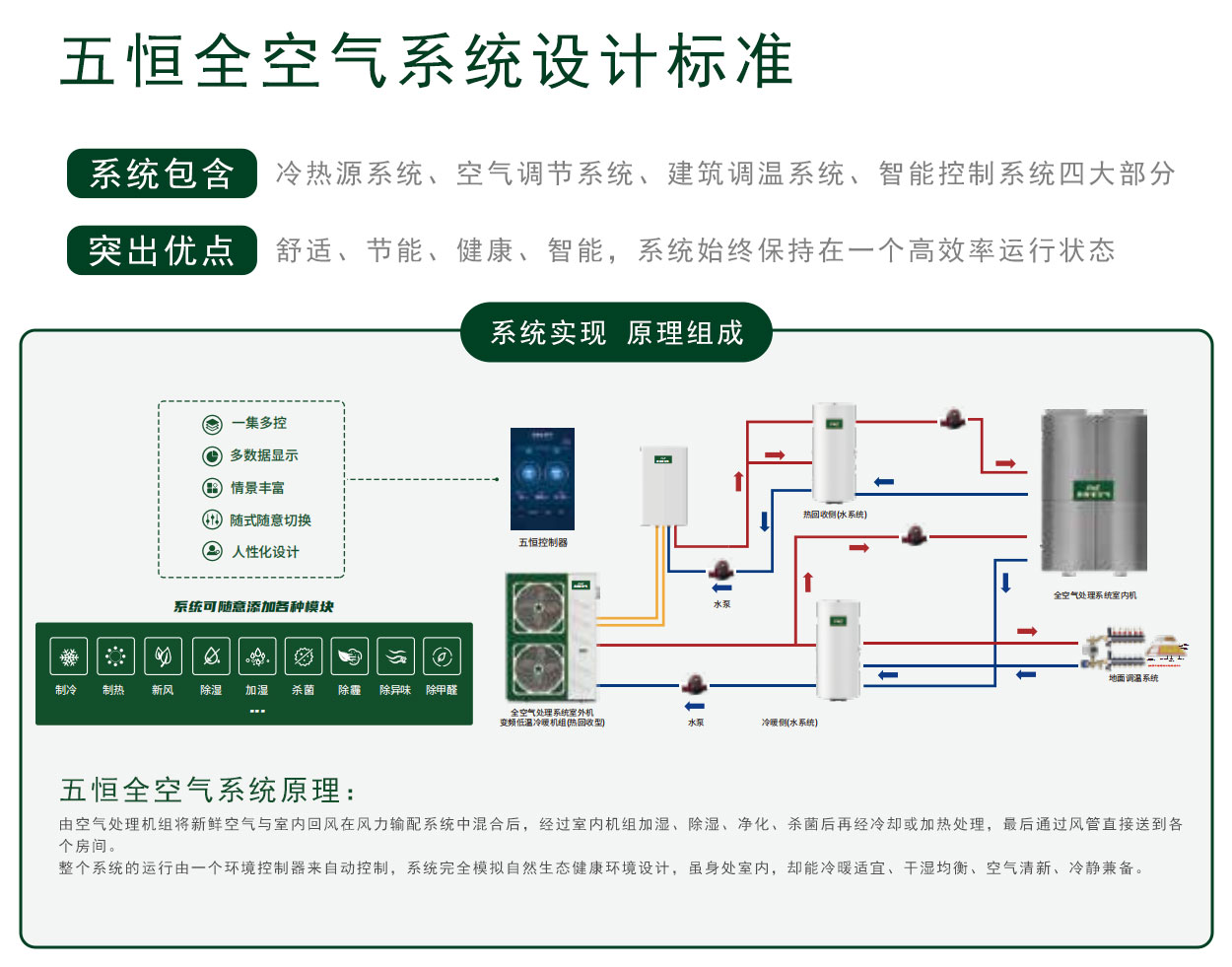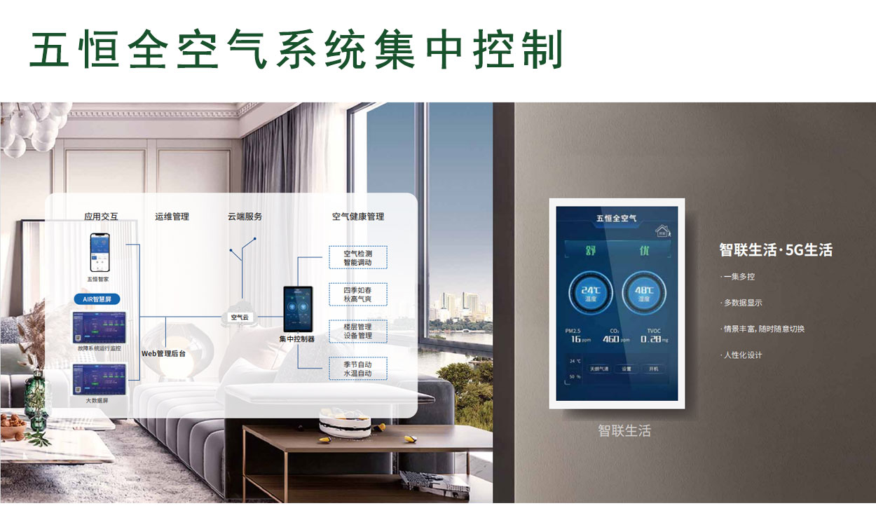 全空氣系統(tǒng)使用一套系統(tǒng)迭代室內(nèi)空調(diào)、采暖、新風、除濕、加濕、空氣凈化、空氣殺菌等多種設(shè)備組合;并以健康體感為標準,電腦精準調(diào)節(jié)全空氣控制邏輯