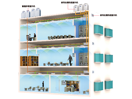 100% 來自室外的空氣,流經(jīng)新風(fēng)內(nèi)機(jī)換熱器時(shí),被處理到合適狀態(tài)后提供到室內(nèi),溫度達(dá)到設(shè)計(jì)要求,又不影響空氣品質(zhì),新風(fēng)負(fù)荷由新風(fēng)機(jī)組承擔(dān)。