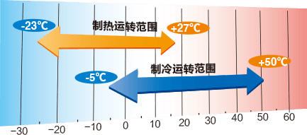 運(yùn)行范圍寬廣,室外溫度達(dá)50℃時(shí)仍可制冷運(yùn)轉(zhuǎn),冬季最低制熱運(yùn)行溫度達(dá)-23℃,冬季制熱效果好。