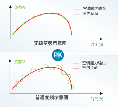 室外機(jī)直流變速壓縮機(jī)的運(yùn)轉(zhuǎn)速度可以根據(jù)系統(tǒng)容量的變化進(jìn)行連續(xù)、自由調(diào)節(jié),精度更高,與自適應(yīng)控制技術(shù)相結(jié)合,根據(jù)實(shí)際空調(diào)負(fù)荷自動(dòng)調(diào)節(jié)能力輸出,保證達(dá)到更平滑的變化曲線來(lái)滿(mǎn)足更高需求的舒適度。