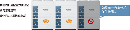 在超過(guò)16HP的系統(tǒng)中,如果一臺(tái)室外機(jī)發(fā)生故障,其余室外機(jī)也能進(jìn)行緊急運(yùn)轉(zhuǎn)。如果是三模塊以上的機(jī)型,一臺(tái)故障,另外兩臺(tái)仍能實(shí)現(xiàn)輪換運(yùn)轉(zhuǎn)