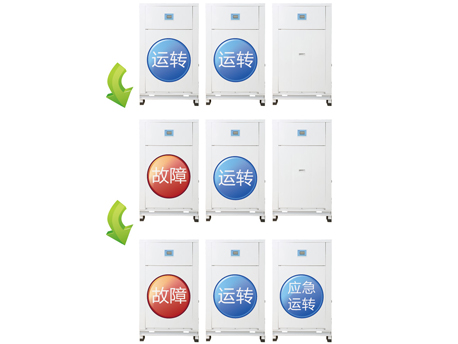 | 無主子模塊設(shè)計 淡化主、子模塊設(shè)計,任意單元模塊均可作為主模塊,輕松應對各種突發(fā)情況;不同容量的單元模塊可以任意組合,最多可實現(xiàn)16臺組合,從而形成不同冷量的機組,應用范圍廣;單一模塊內(nèi)任意一臺機組出現(xiàn)故障,模塊內(nèi)其他機組不受影響,保證整個系統(tǒng)的冷量供應。 | 人性化設(shè)計,智能化管理 機組控制系統(tǒng)內(nèi)置水泵連鎖功能,啟停運轉(zhuǎn)時,自動控制循環(huán)水泵、潛水泵的啟停運轉(zhuǎn);同時,可預設(shè)運行時段,配合機組運轉(zhuǎn)調(diào)節(jié)和保護功能,按需運行,可實現(xiàn)無人值守,節(jié)約運行費用。 |